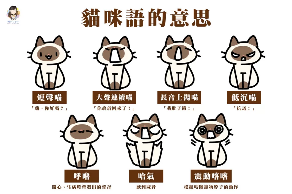 「呼嚕呼嚕」:開心、滿足時會呼嚕外,受傷或是生病時也會發出同樣的聲音。