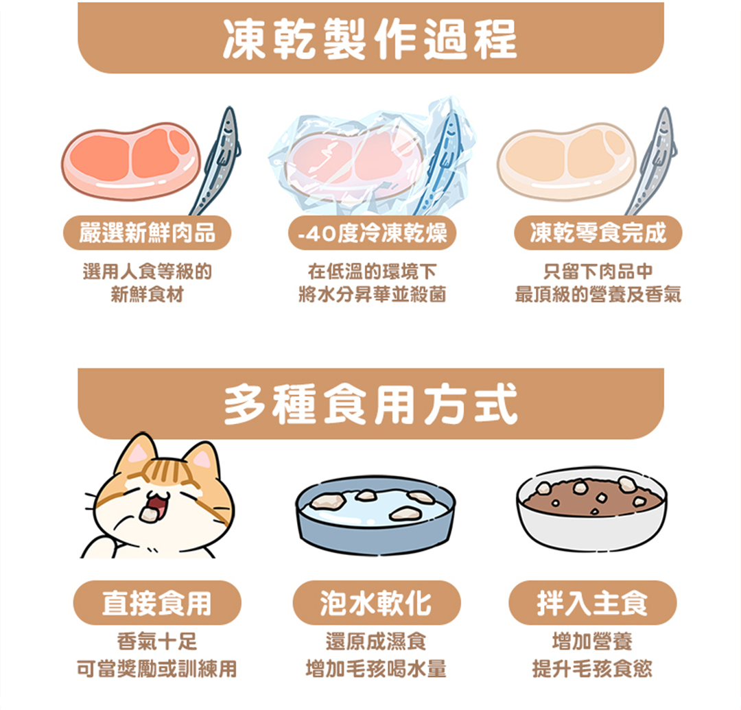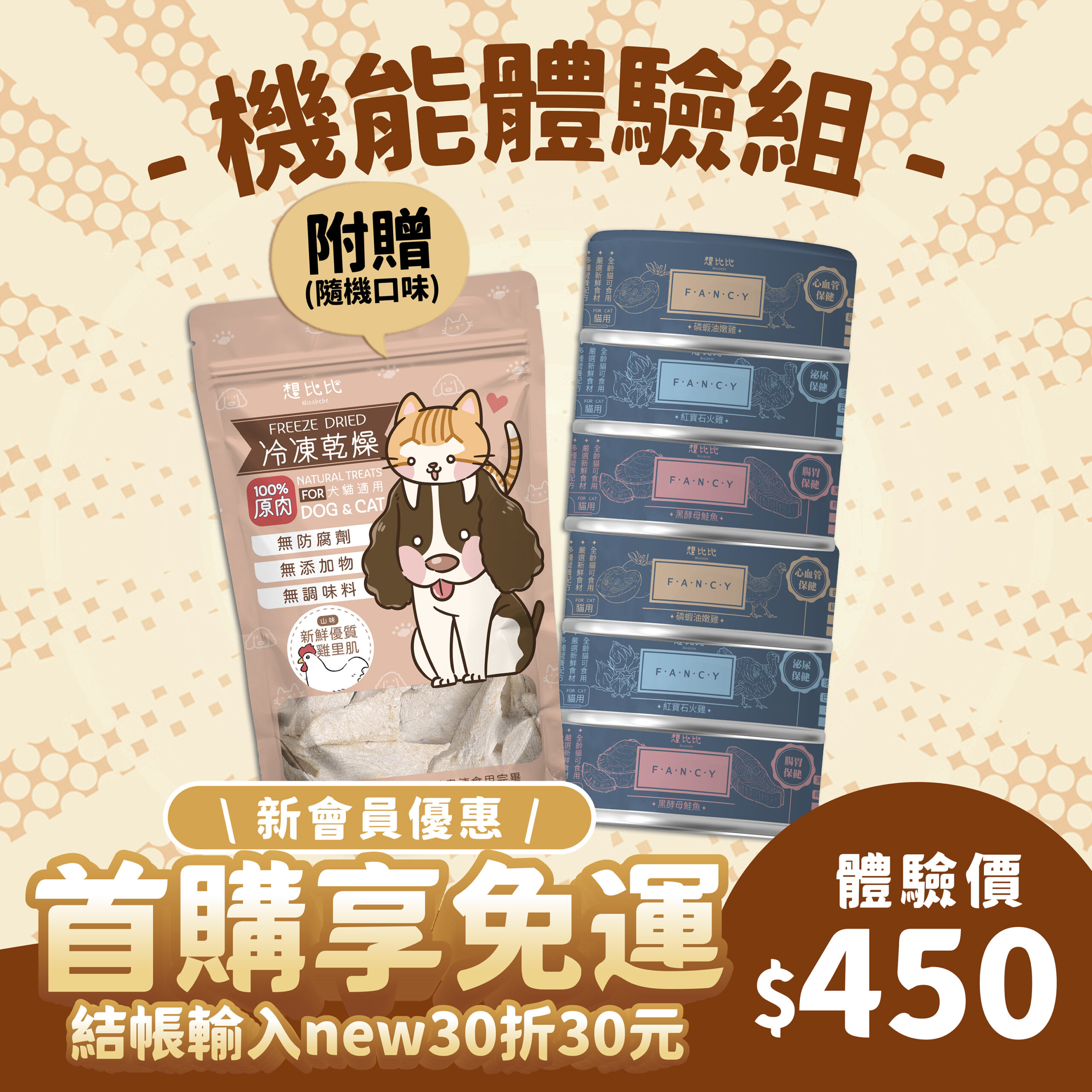 體驗組內含: • 豪華機能主食罐(3種口味)x6 • 超心凍系列凍乾x1(隨機)